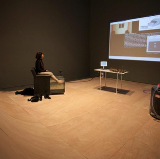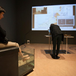 The Bladder of Gaia is a multi-species series of rituals. It consists of individual fish pedicures conducted while being immersed in sound and data visualization projected on the surrounding walls as well as a water ritual that revitalizes plants. The visualizations depict information associated with an aquifer referred to as “The Bladder of Gaia” and includes a live stream connection with the artist who is located in the desert. Via a technological substitute, the artist is both present and absent, paralleling the presence and absence of water, one of the main motifs in this work. Focusing on the instrumentalization and necessity of resources and living knowledge, the creepy but cathartic ritual offered to viewers in The Bladder of Gaia creates a space for the contemplation of climate science and landscape tropes. It reflects and critiques territorial behavior in the age of software, Big Data, and geo-biopower whose nexus is water and the commons.